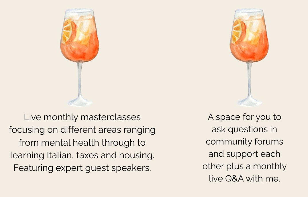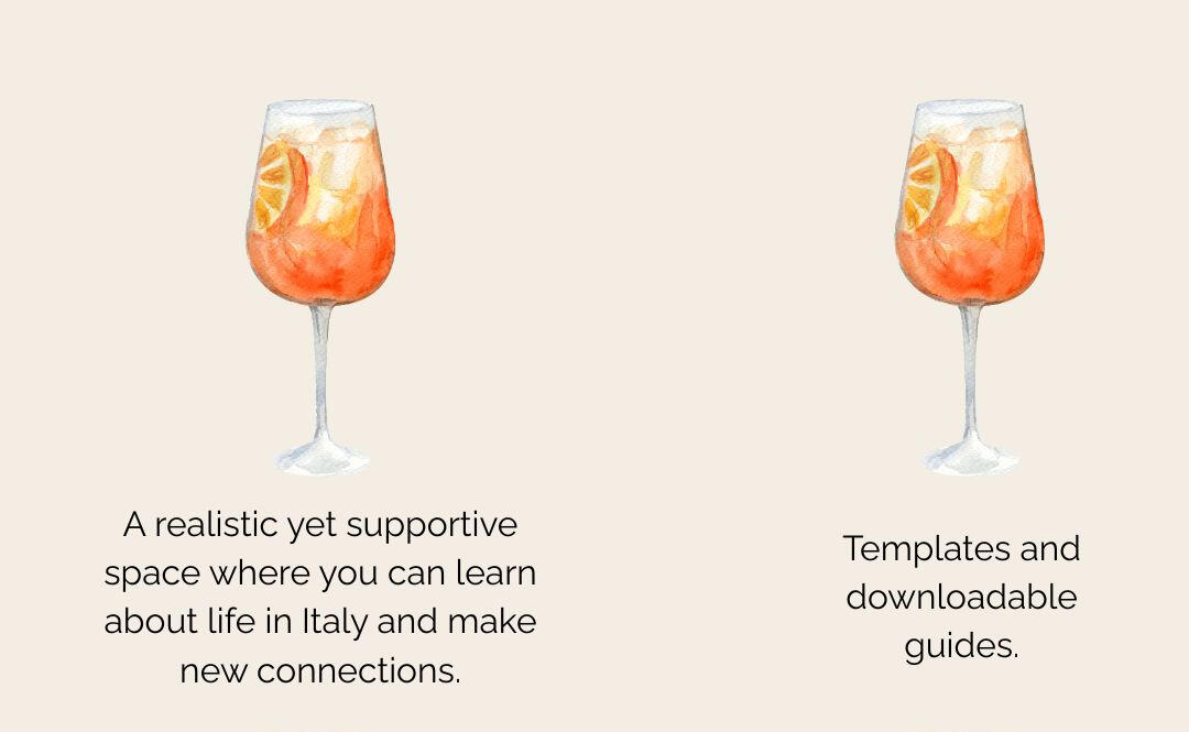 An aperitivo is a very social way in Italy, to get together with friends or family over a drink before you eat your main meal. It’s a chance for a catch up and a good conversation!Leaning into those vibes, The Aperitivo Lounge is an uplifting space designed to nurture and educate those of you planning to move to Italy as well as those of you who are already living here. I’ve been living in Italy now for 7 years and I know first hand the challenges but also the beauty of life here. I also know how having a strong community can radically improve your experience.My mission is simple: to build a supportive community and help even more of you thrive in your life in Italy